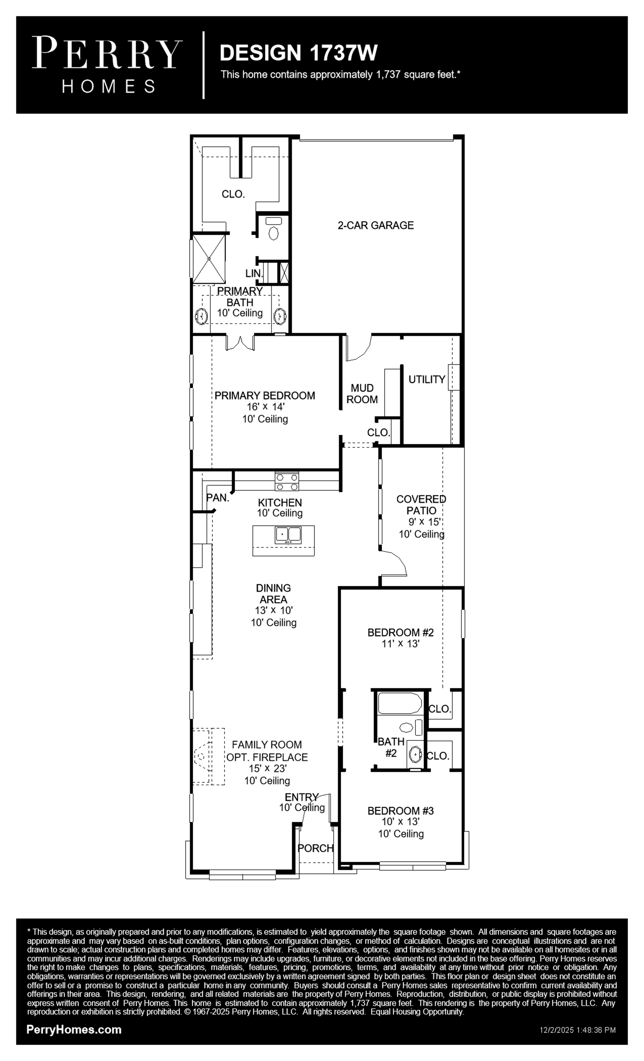 Builder reserves the right to make changes in the designs and specifications, and to substitute material of similar quality. Prices, terms, promotions, plans, dimensions, features, options, amenities, elevations, designs, square footages, specifications, materials and availability of homes or communities are subject to change without notice or obligation. All obligations will be governed by a written contract. This website does not constitute a commitment to build a particular design or home in any given community. Some designs, options, and/ or elevations may not be available on certain homesites or in a particular community and may require additional charges. Please check with Perry Homes to verify current offerings in the communities you are considering.