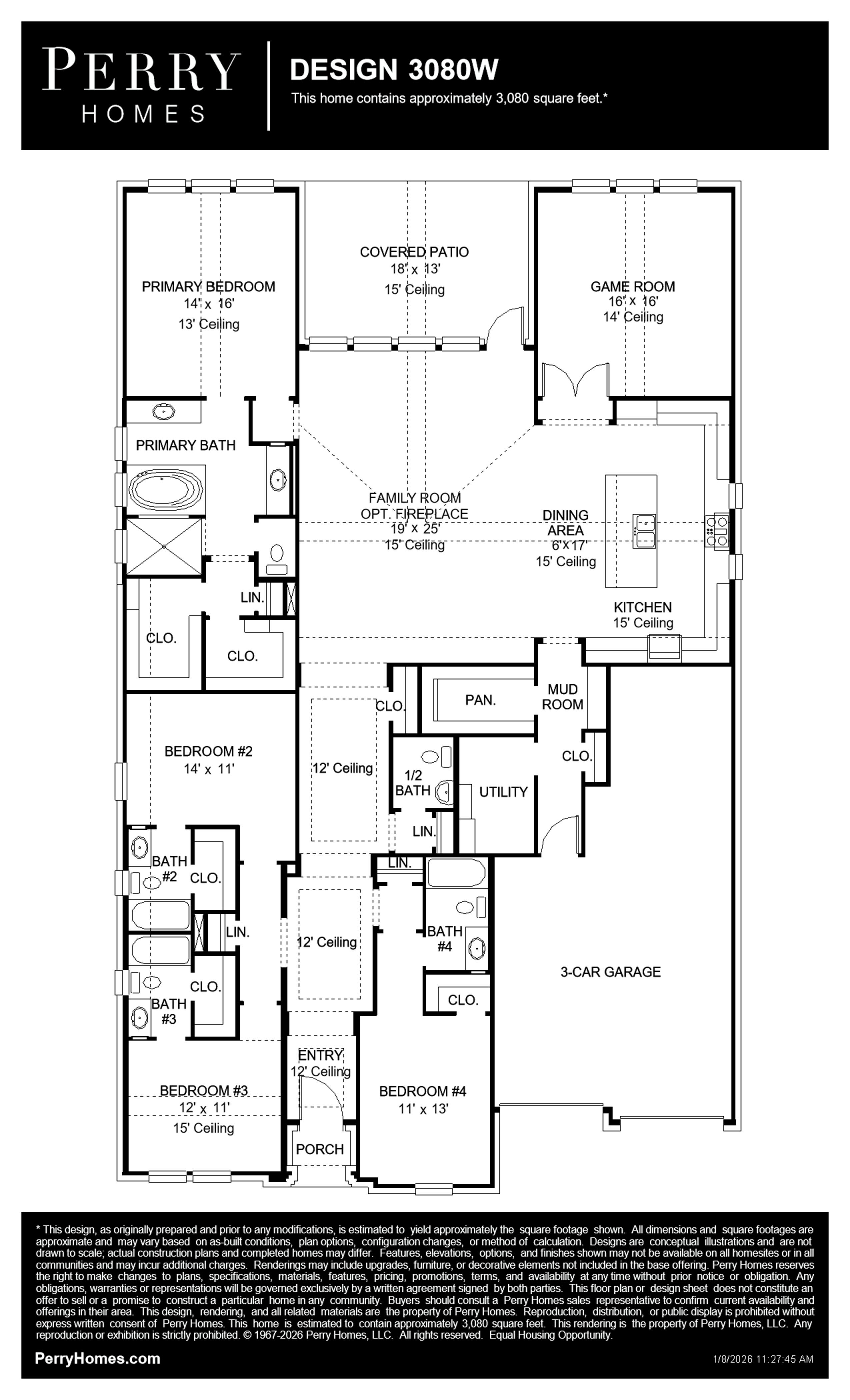 Builder reserves the right to make changes in the designs and specifications, and to substitute material of similar quality. Prices, terms, promotions, plans, dimensions, features, options, amenities, elevations, designs, square footages, specifications, materials and availability of homes or communities are subject to change without notice or obligation. All obligations will be governed by a written contract. This website does not constitute a commitment to build a particular design or home in any given community. Some designs, options, and/ or elevations may not be available on certain homesites or in a particular community and may require additional charges. Please check with Perry Homes to verify current offerings in the communities you are considering.