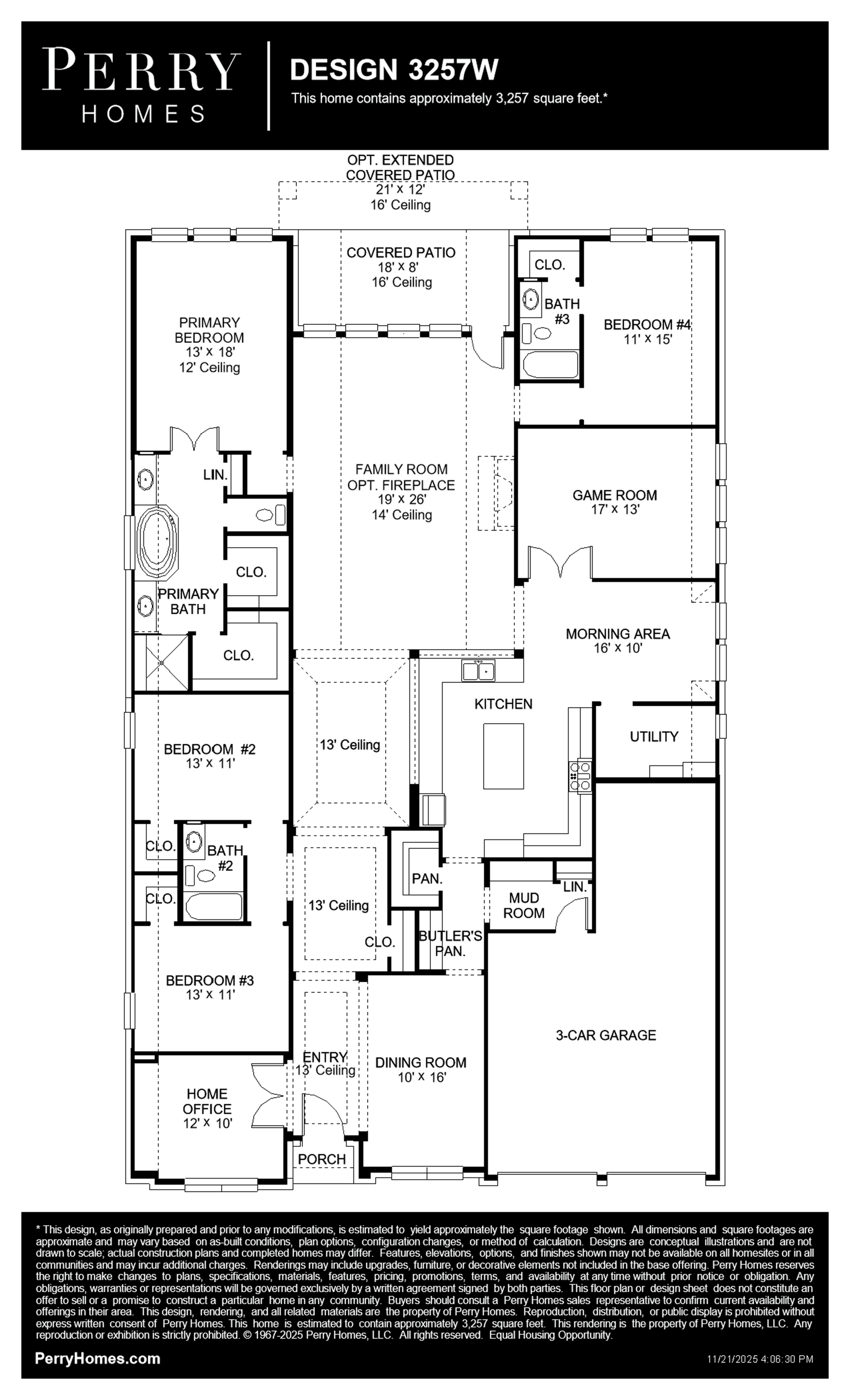 Builder reserves the right to make changes in the designs and specifications, and to substitute material of similar quality. Prices, terms, promotions, plans, dimensions, features, options, amenities, elevations, designs, square footages, specifications, materials and availability of homes or communities are subject to change without notice or obligation. All obligations will be governed by a written contract. This website does not constitute a commitment to build a particular design or home in any given community. Some designs, options, and/ or elevations may not be available on certain homesites or in a particular community and may require additional charges. Please check with Perry Homes to verify current offerings in the communities you are considering.