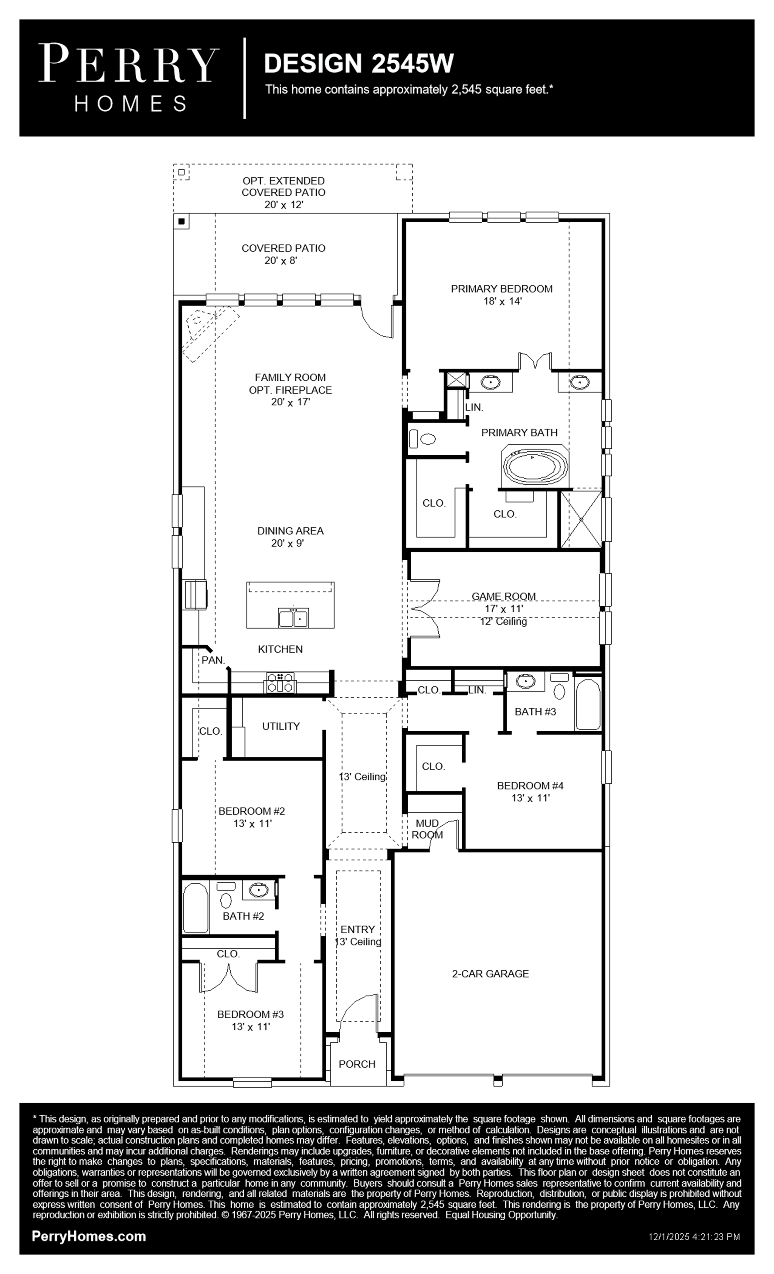 Builder reserves the right to make changes in the designs and specifications, and to substitute material of similar quality. Prices, terms, promotions, plans, dimensions, features, options, amenities, elevations, designs, square footages, specifications, materials and availability of homes or communities are subject to change without notice or obligation. All obligations will be governed by a written contract. This website does not constitute a commitment to build a particular design or home in any given community. Some designs, options, and/ or elevations may not be available on certain homesites or in a particular community and may require additional charges. Please check with Perry Homes to verify current offerings in the communities you are considering.