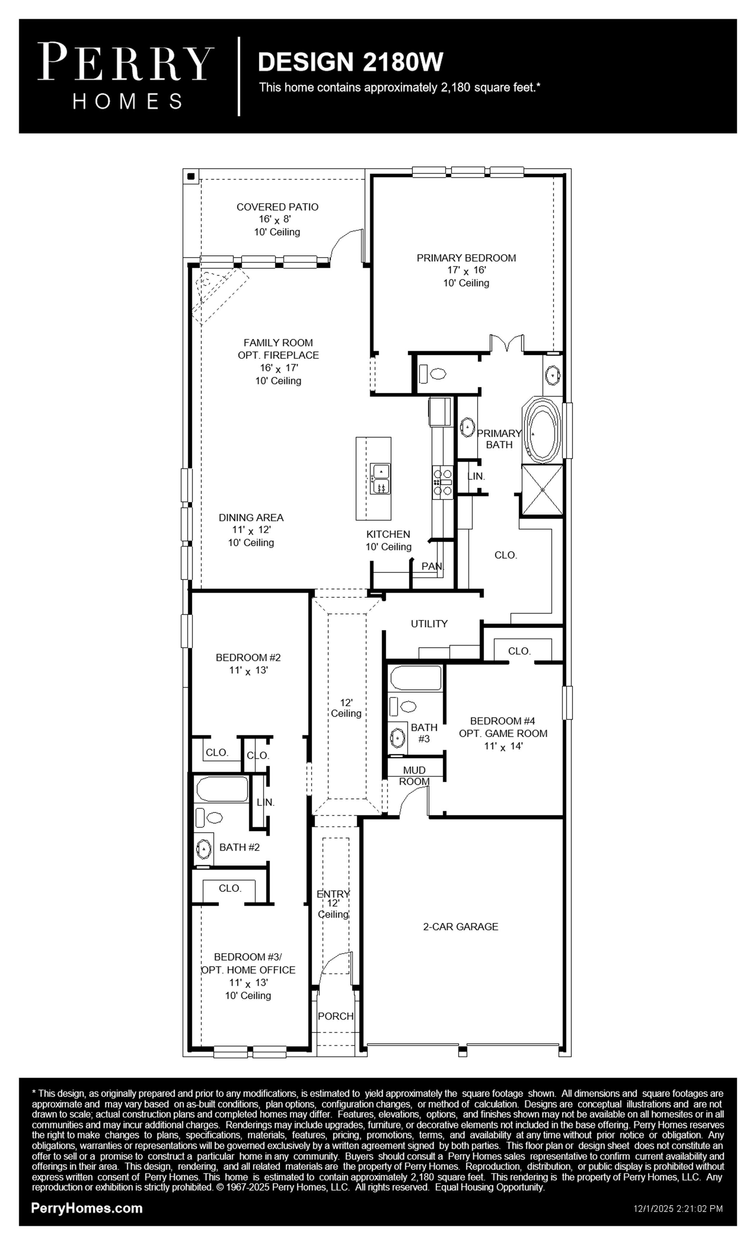 Builder reserves the right to make changes in the designs and specifications, and to substitute material of similar quality. Prices, terms, promotions, plans, dimensions, features, options, amenities, elevations, designs, square footages, specifications, materials and availability of homes or communities are subject to change without notice or obligation. All obligations will be governed by a written contract. This website does not constitute a commitment to build a particular design or home in any given community. Some designs, options, and/ or elevations may not be available on certain homesites or in a particular community and may require additional charges. Please check with Perry Homes to verify current offerings in the communities you are considering.
